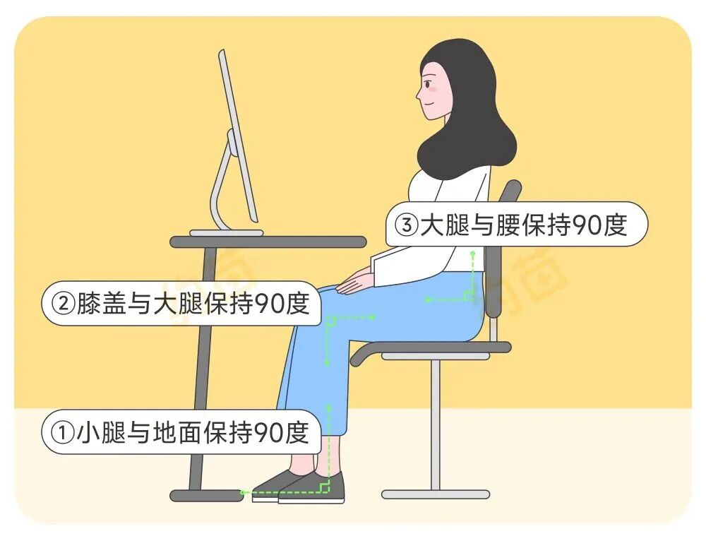 髋关节90度:臀部完全接触椅面,背部与大腿呈直角;